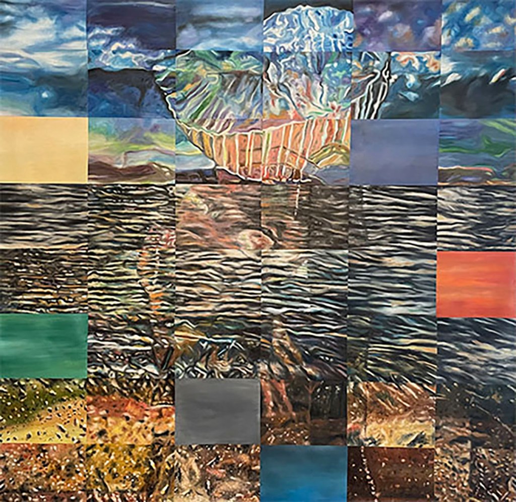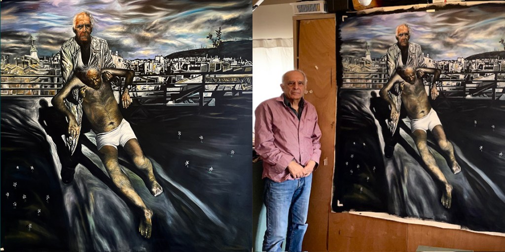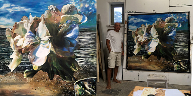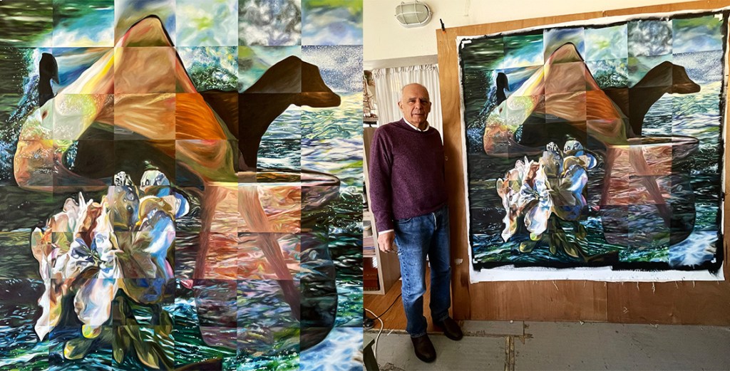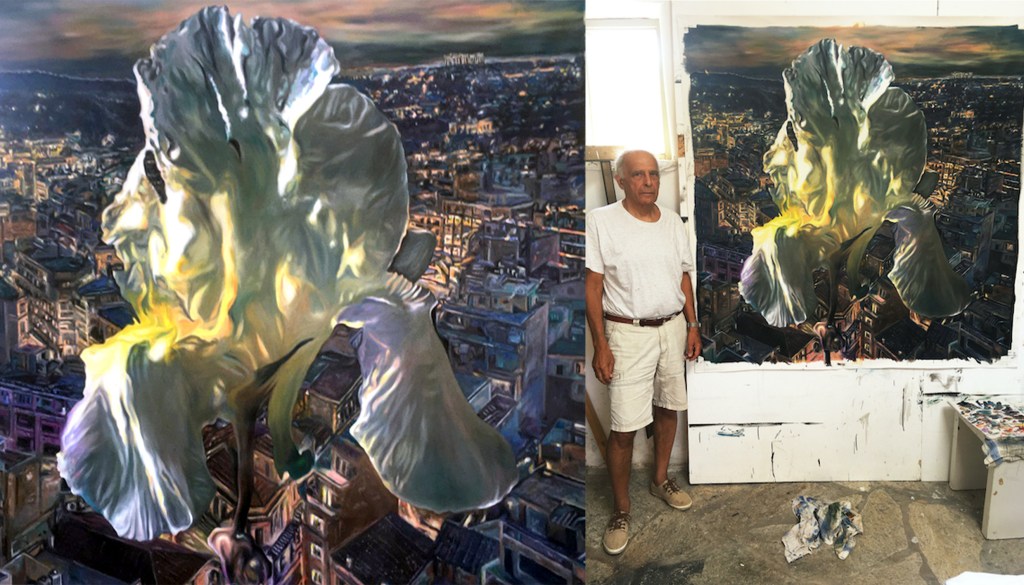 2021 160×160 cm oil on canvasRM and “Diogenes” 2023 160 x 160 cm oil on canvasRM and “Iris Athens by Night”. 2022 160 x 160 cm oil on canvas“Cadavre exquis II- Seasacpe, dog, cala lily, vase, geranaium”“White Rose in Floating Glass”