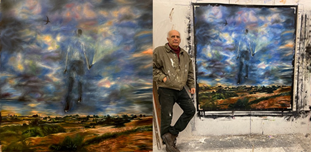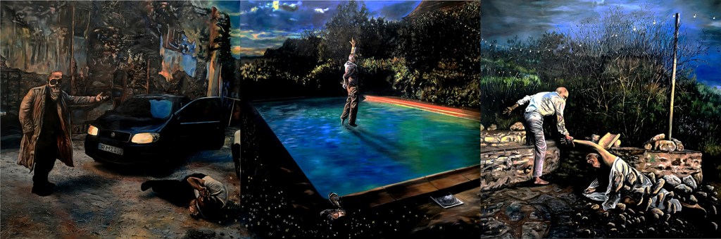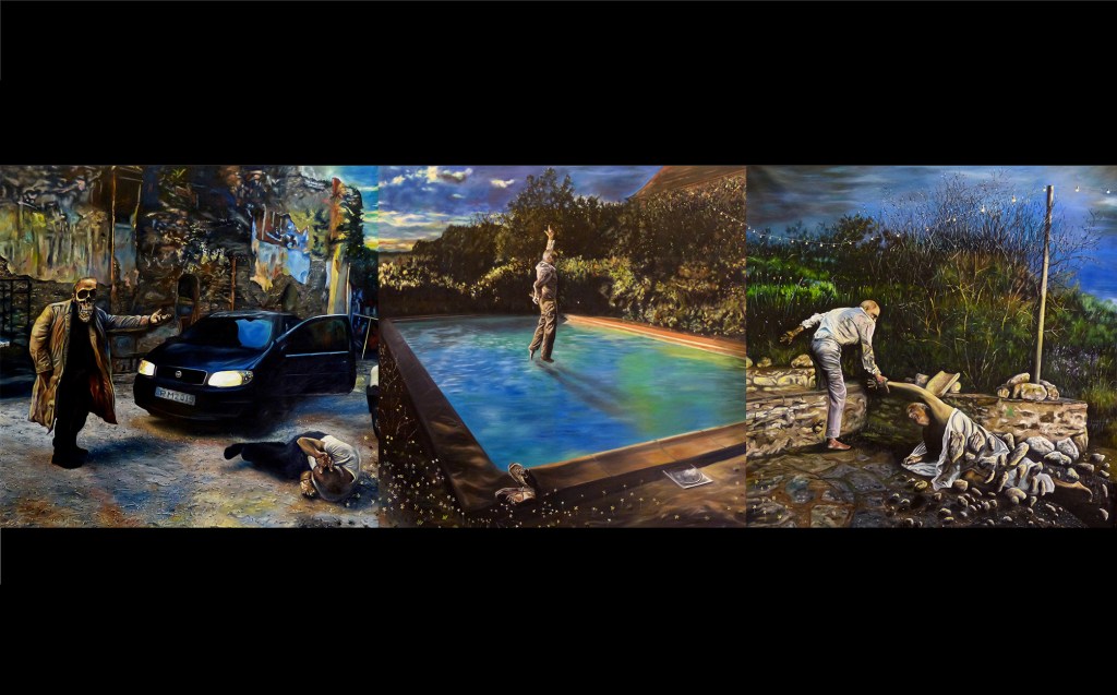 Triptych “La Mort, Resurrection et Renouvellment” 2019 1.6m x 4.8m oil on canvas RM and “White Rose for Baudelaire”