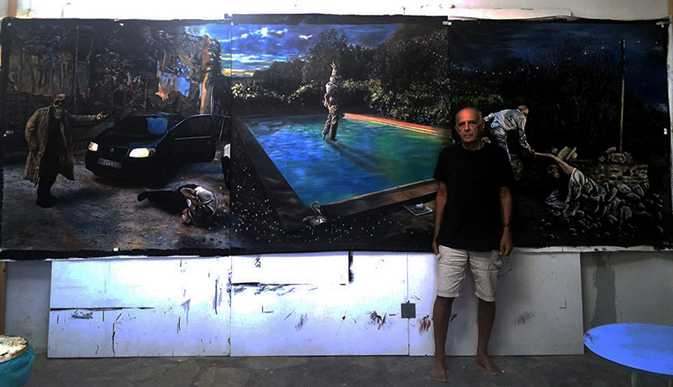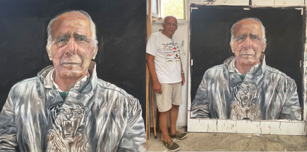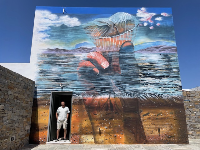 ‘Self-and-Tiger’, 2025, 160 x 160 cm, oil on canvas RM and “My Brother’s Death” 2024 160 x 160cm, oil on canvasRM and “Iris Nebula” 2022 160 x 160cm oil on canvas“Inspecting Eternity Again”, 2024, 160 x 160 cm, oil on canvasMural, 2024, 7 x 7m, Paros Island, Greece“Shell, sea and hand”, 2024 160 x 160 cm, oil-on-canvasRM and “Cadavre Exquis” 2022 160 x 160cm oil on canvasRM and “Wilted Geranium”